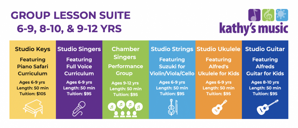 Group Lessons for ages 6-9 and 9-12 use a community-centered approach for the foundational years of instrumental and vocal instruction.